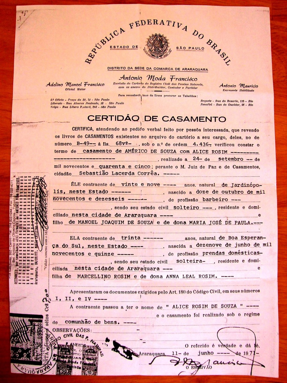 Marriage Certificate (Certidão de Casamento) – Americo de Souza & Alice Rosim (Rosin) – 24/9/1945 – Boa Esperança. Américo de Souza, born in (nascido em) 12/10/1916 – Jardinópolis, barber (barbeiro), resident in (morador de) Araraquara, 29 years old (29 anos) , son of (filho de) Manuel Joaquim de Souza & Maria José de Paula. Alice Rosim, born in (nascida em) 19/6/1915 – Boa Esperança do Sul, 30 years old (30 anos),resident in (moradora de) Araraquara, daughter of (filha de) Marcellino Rosim & Anna Leal Rosim.