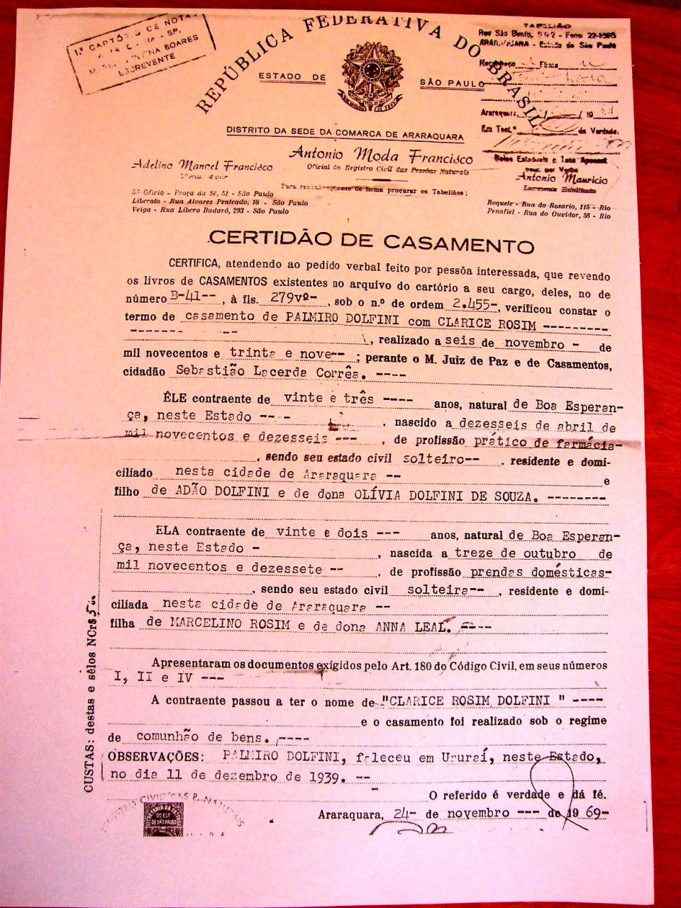Marriage Certificate (Certidão de Casamento) – Palmiro Dolfini & Clarice Rosim (Rosin) – 6/11/1939 – Araraquara. Palmiro Dolfini, born in (nascido em) 16/4/1916 – Boa Esperança, nurse (enfermeiro), resident in (morador de) Araraquara, 23 years old (23 anos) , son of (filho de) Adão Dolfini & Olivia Dolfini de Souza. Clarice Rosim, born in (nascida em) 13/10/1917 – Boa Esperança, 22 years old (22 anos), resident in (moradora de) Araraquara daughter of (filha de) Marcelino Rosim & Anna Leal.