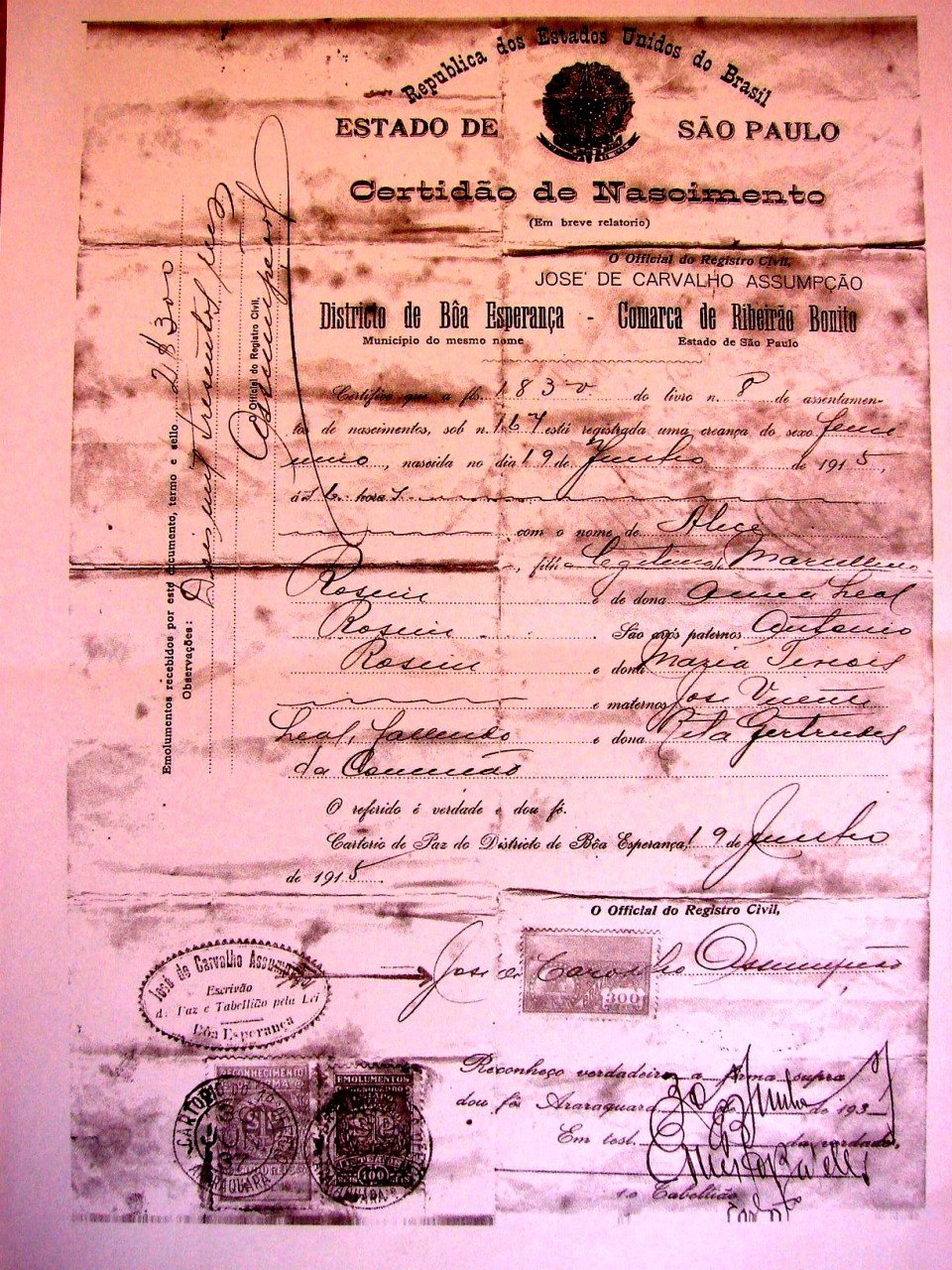 Alice Rosim – Birth Certificate – Certidão de Nascimento – 19/6/1915