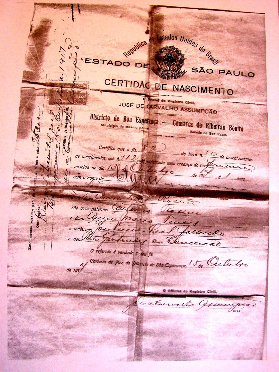 Clarice Rosim – Birth Certificate – Certidão de Nascimento – 13/10/1917.