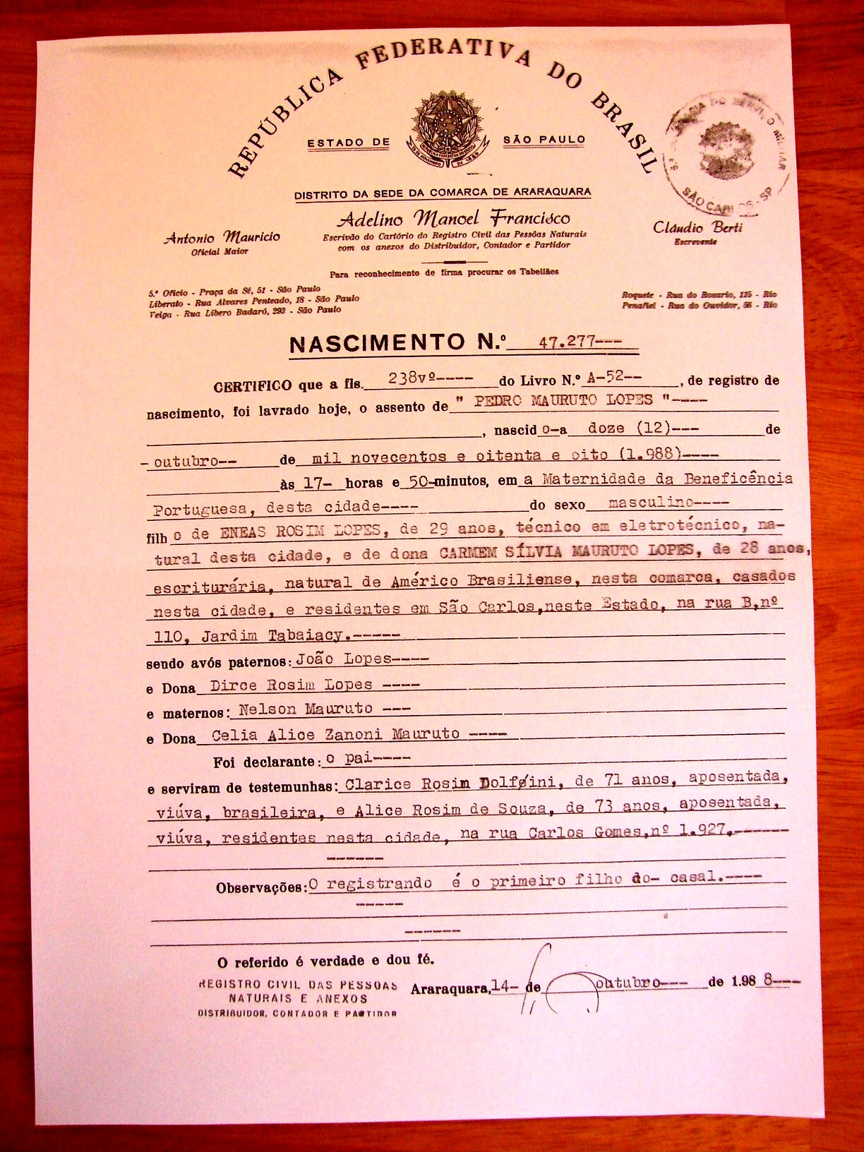 Pedro Mauruto Lopes – Birth Certificate – Certidão de Nascimento – 12/10/1988.