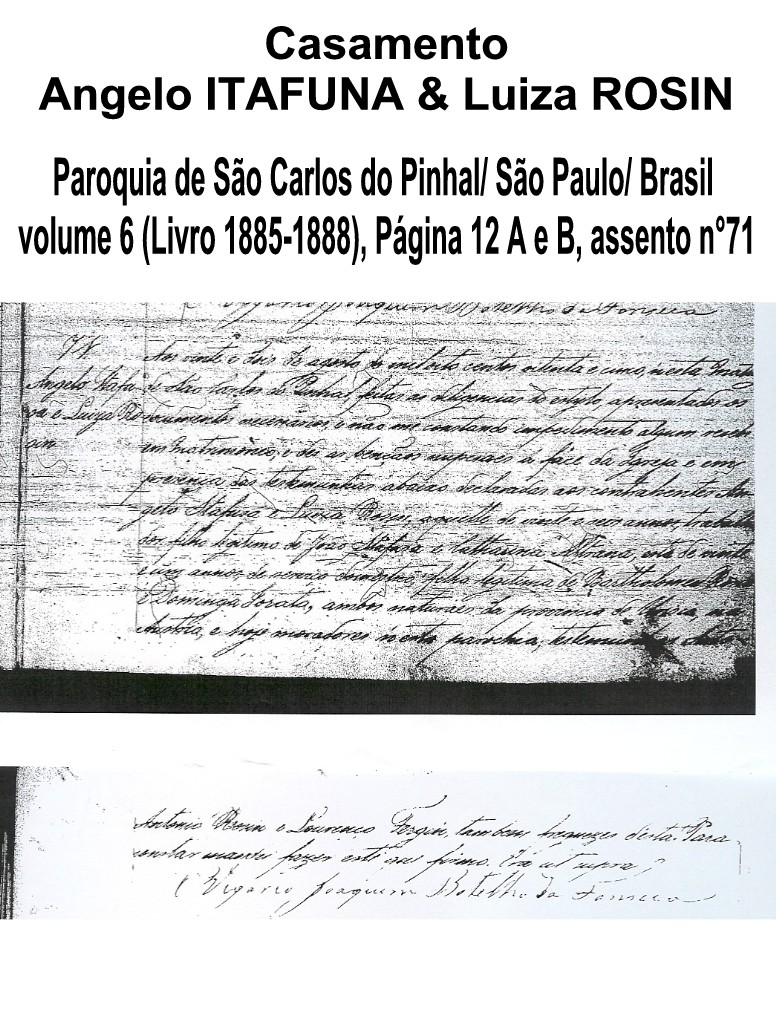 “Aos vinte e dois de agosto de mil oito centos oitenta e cinco, nesta Matriz de São Carlos do Pinhal, feitas as diligencias do estylo, apresentados os ducumentos necessarios e não me constando impedimento algum recebi em matrimonio e dei as bençãos nupciais a fase da Igreja e em presença das testemunhas abaixo declaradas aos contrabentes ANGELO ITAFUSA e LUIZA ROSIN, aquelle de vinte e seis annos, trabalhador filho legitimo de João Itafusa e Catharina Altrana, esta de vinte e um annos, de serviço domestico, filha legitima de Bartholomeu Rosin e Dominga Lorata, ambos naturais da provincia de Urisca (*Gorizia), na Austria e hoje moradores nesta parochia; testemunhas ANTONIO ROSIN e LOURENçO FERGIN (* Lourenzo Feresin), também freguezes desta. Para constar mandei fazer este que firmo. “Era ut supra”