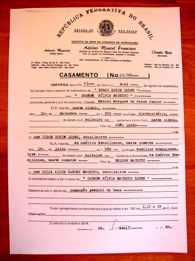 Marriage Certificate (Certidão de Casamento) – Enéas Rosim Lopes & Carmem Silvia Mauruto – 8/4/1988 – Araraquara. Eneas Rosim Lopes, born in (nascido em) 10/9/1959 – Araraquara, electrician (eletricitário), resident in (morador de) Araraquara, son of (filho de) João Lopes & Dirce Rosim Lopes. Carmem Silvia Mauruto, born in (nascida em) 1/7/1960 – Américo Brasiliense, resident in (moradora de) Américo Brasiliense daughter of (filha de) Nelson Mauruto & Célia Alice Zanoni Mauruto.