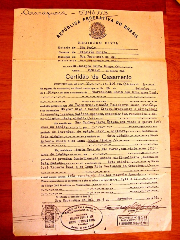 Marriage Certificate (Certidão de Casamento) – Marcelino Rosim (Rosin) & Anna Leal – 26/9/1914 – Boa Esperança. Marcelino Rosim, born in (nascido em) São Carlos, farmer (lavrador), resident in (morador de) Boa Esperança, 24 years old (24 anos) , son of (filho de) Antonio Rosim ( Antonio Rosin) & Maria Tinóis ( Anna Maria Tinos). Anna Leal, born in (nascida em) Santa Cruz do Rio Pardo, 21 years old (21 anos), daughter of (filha de) José Vicente Leal & Rita Gertrudes da Conceição.