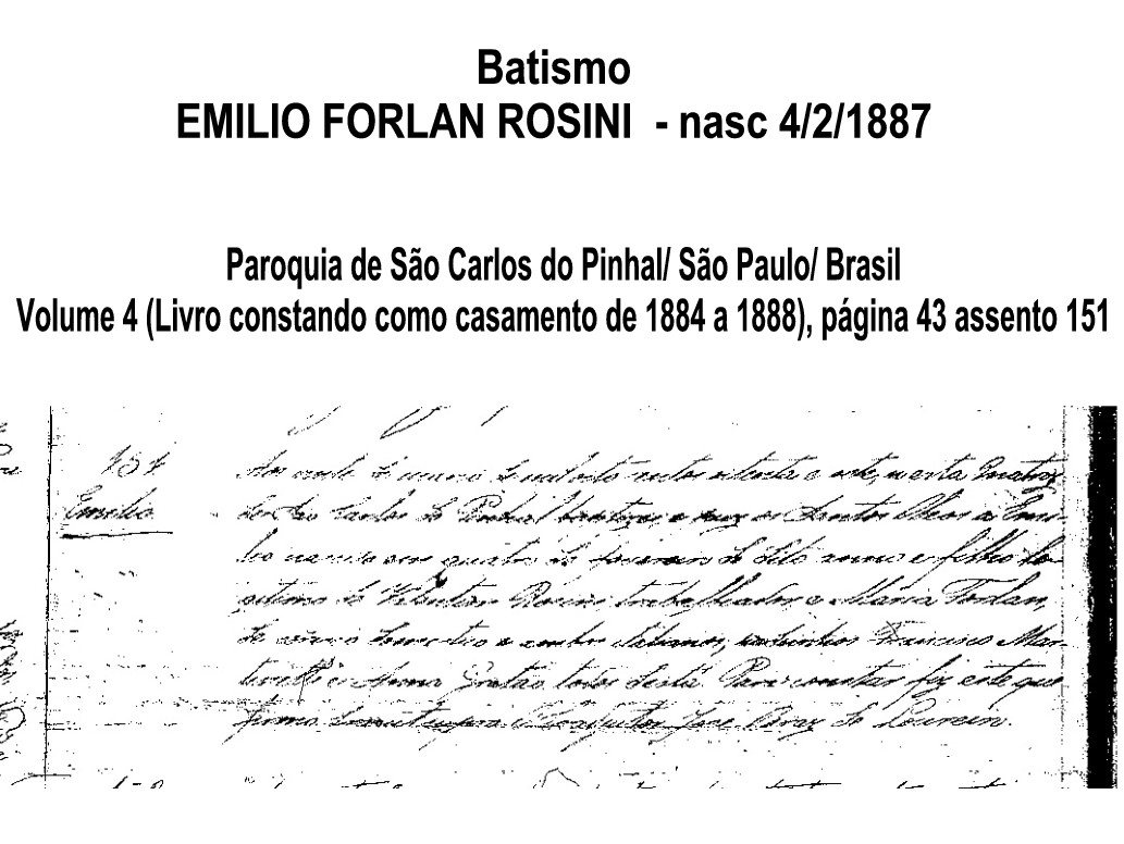 “Aos vinte de março de mil oito centos oitenta e sete, nesta Matriz de São Carlos do Pinhal baptizei e pus os Santos Oleos a EMILIO nascido em quatro de fevereiro do dito anno e filho legitimo de VALENTIM ROSINI (* Valentino Rosin) , trabalhador e MARIA FORLAN (* Maria Furlan), de serviço domestico e ambos italianos; padrinhos Francisco Martinelli e Anna Gastão todos desta. Para constar fiz este que firmo. “Era ut supra”