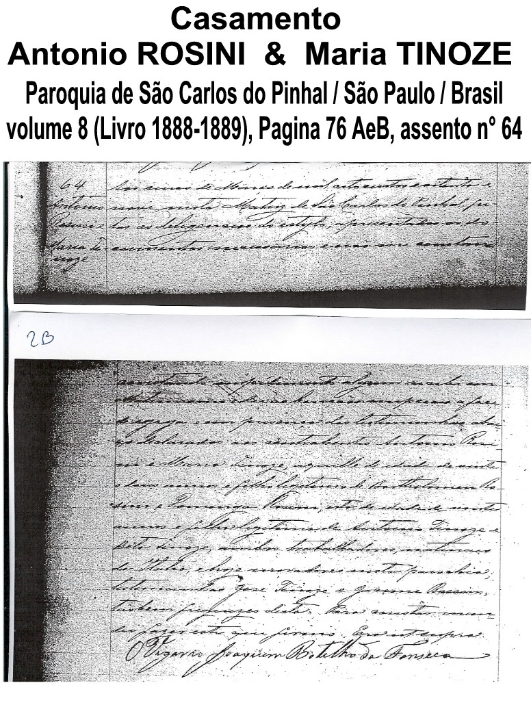“Aos cinco de março de mil oito centos e oitenta e nove, nesta Matriz de São Carlos do Pinhal, feitas as diligencias do estylo, apresentados os documentos necessarios e não me constando impedimento algum recebi em matrimonio e dei as bençãos nupciais á face de egreja” e em presença das testemunhas abaixo declaradas aos contrabentes ANTONIO ROSINI (* Antonio Rosin) e MARIA TINOZE (* Maria Tinos), aquelle de idade de vinte e dois annos e filho legítimo de Bartholomeu Rosini e Dominga Rosini; esta de idade de vinte anos e filha legitima de Antonio Tinoze (* Antonio Tinos) e Bela Tinoze (* Elisabetta Grassetti), ambos trabalhadores, naturais da Italia, e hoje moradores nesta parochia; testemunhas Jose Tinoze (* Giuseppe Tinos) e Jacome Rossin (* Giacommo Rosim), tambem freguezes desta. Para constar mandei fazer este que firmo. “Era est sunpra”.
