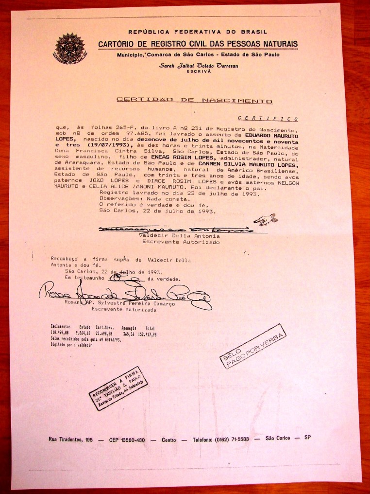 – 1) Paternal – Imigração Cafeeira para Fazenda Santa Eudóxia, São Carlos, Bebedouro e Colina em São Paulo – Gomes Areias de Pombal, Portugal e Tinos do Friuli, Itália (Ex-Áustria)