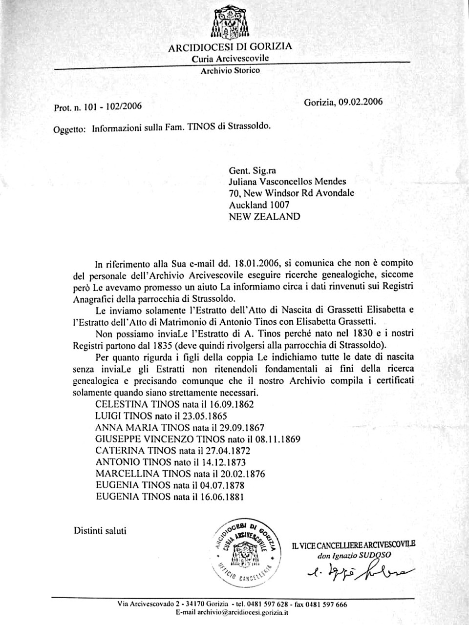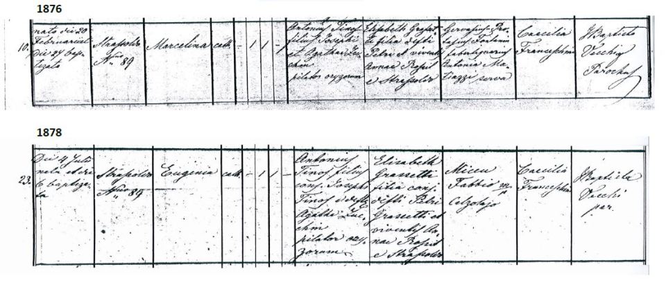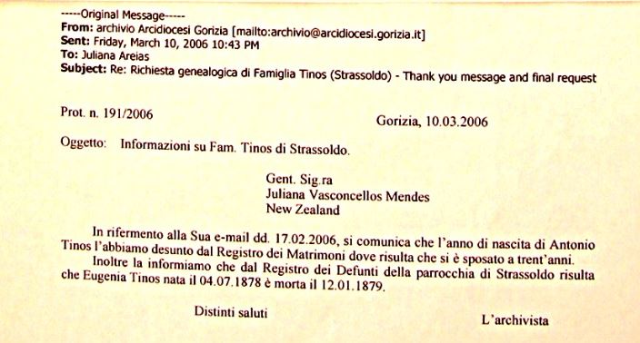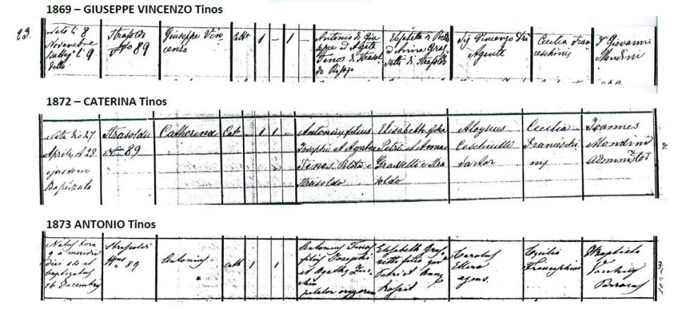 - Parrochia di San Nicolo di Strassoldo –Specific Baptism Registers between 1830- 1881 (Registros de Batismo específicos entre 1830-1881): Antonio Tinos (I) and his 9 children (e seus 9 filhos):Celestina, Luigi, Anna Maria, Giuseppe Vincenzo (V), Catarina, Antonio (II), Marcellina, Eugenia (I), Eugenia (II) and his nephew (e seu sobrinho) Giuseppe (IV), all born at house 89 (todos nascidos na casa 89), except (exceto) Antonio Tinos I born at house 98 in 1830 (nascido na casa 98 em 1830) & Eugenia (II) born at house 45 in 1881 (nascida na casa 45 em 1881).