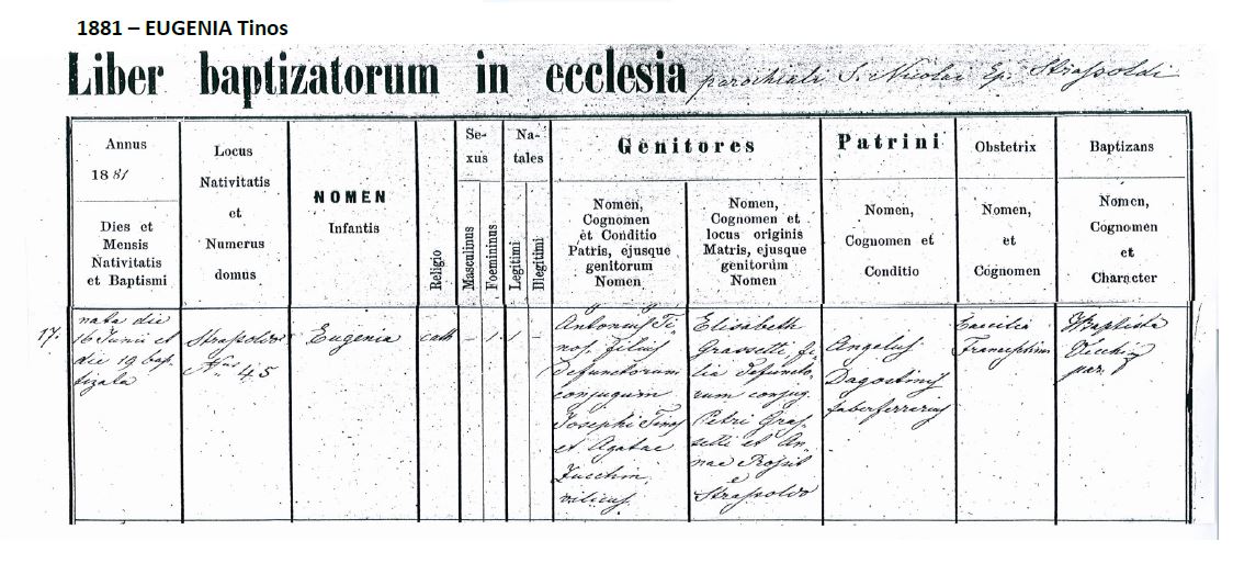 - Eugenia Tinos (II), daughter of (filha de) Antonio Tinos & Elisabetta Grassetti. Antonio Tinos, son of deceased (filho do finado) Giuseppe Tinos & deceased (finada) Agata Zucchin from (de) Strassoldo. Antonio Tinos, “vilicus”, farm overseer /estate manager (supervisor, capataz de fazenda /gerente de propriedade). Elisabetta Grassetti, daughter of deceased (filha do finado) Pietro Grassetti & deceased (finada) Anna Rossit from (de) Strassoldo. Godfather (padrinho): Angelo Dagustini Ceschiutti “faberferrarius”, blacksmith (ferreiro). Born at house 45 (nascida na casa 45) – 16/6/1881.
