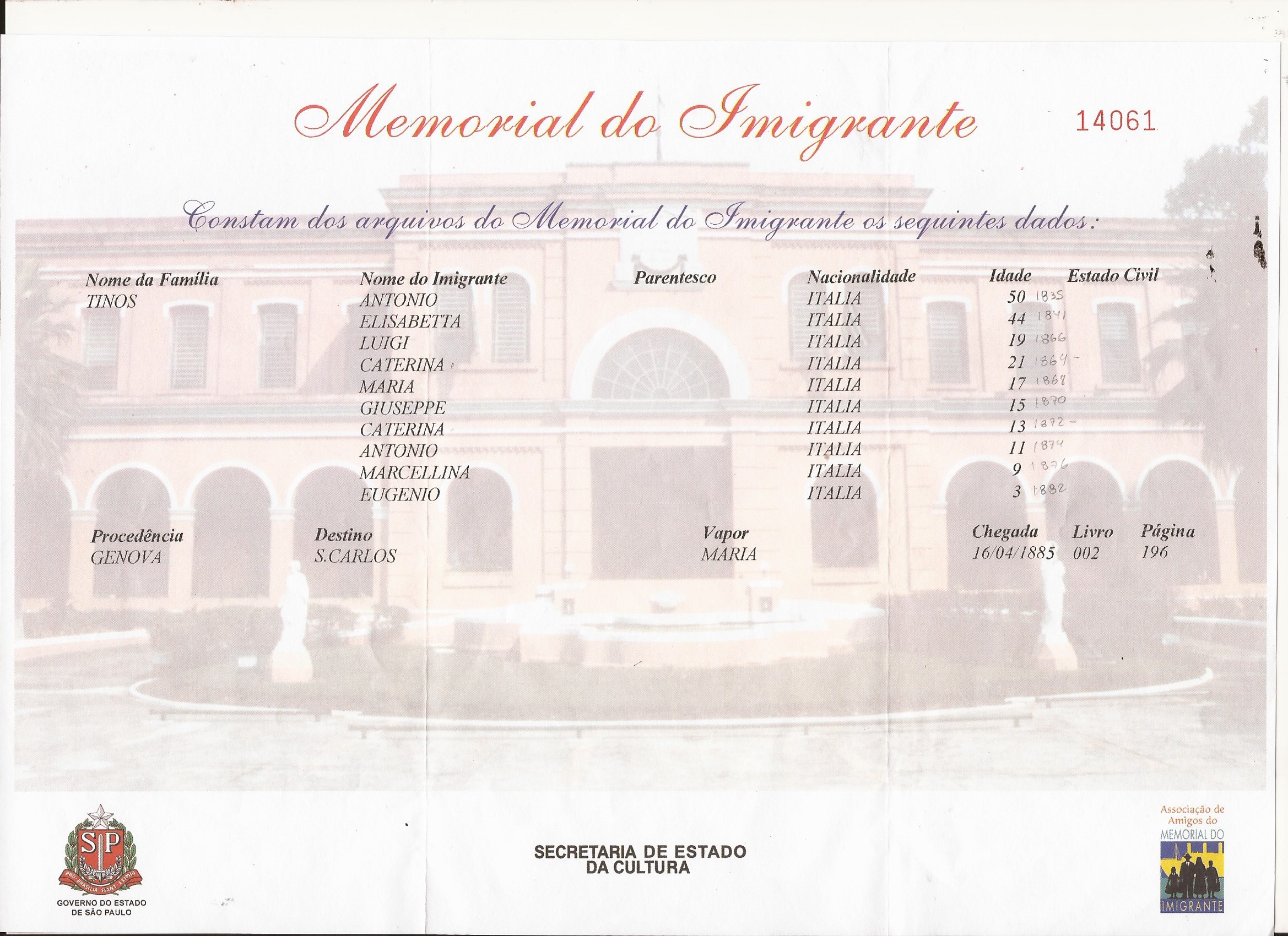 The Tinos Family arrived in Santos on 15/4/1885 and at the Bom Retiro Hostelry of the Immigrants in São Paulo on 16/4/1885. They came in the Steamship Maria to work in São Carlos, at Boa Esperança Farm. Family composition below:
