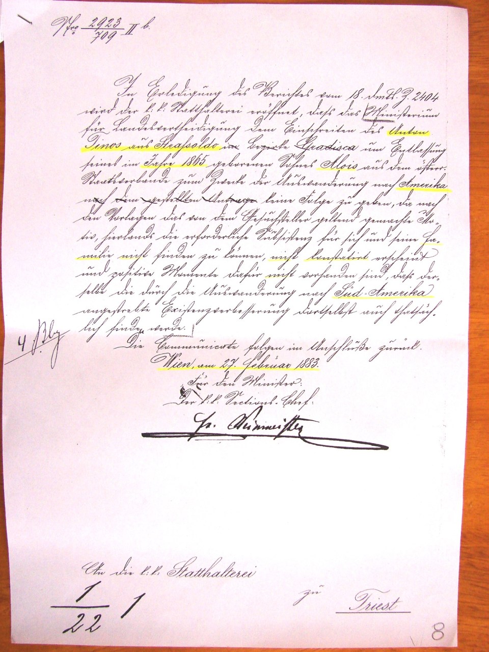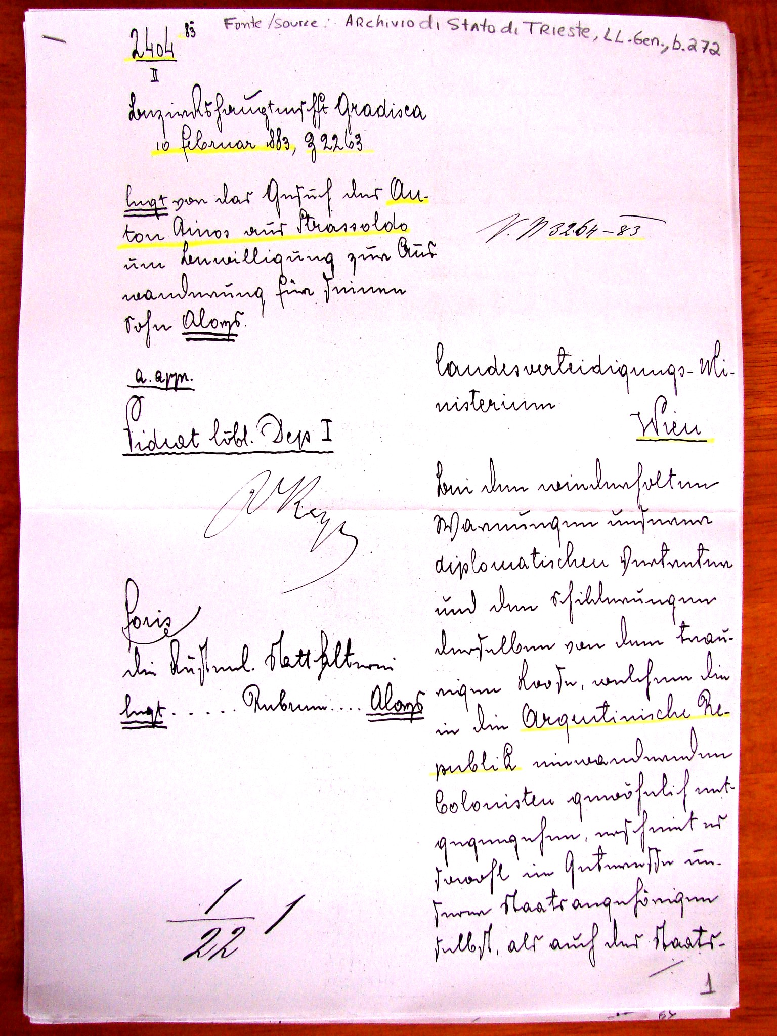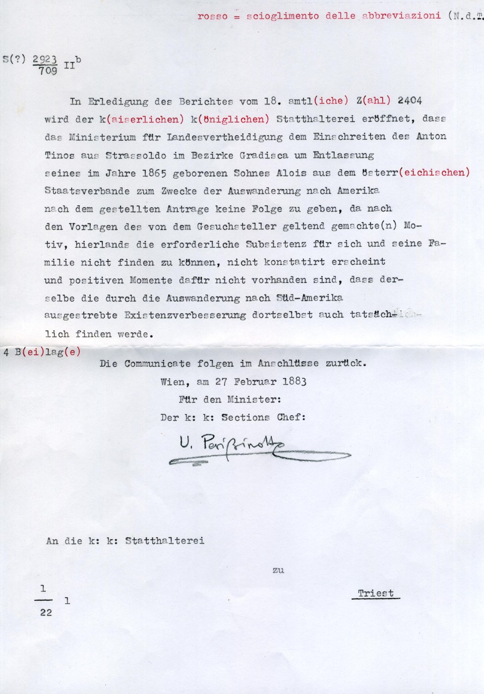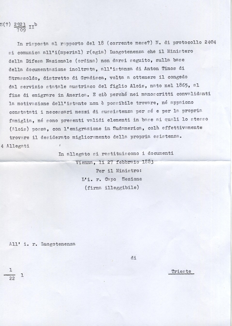 In response to the report of the 18th (current month), protocol number 2404, the “Government of the Royal Empire” is informed that the Ministry of National Defense (orders) to not proceed, based on the documentation presented, to “Request” from ANTON (Antonio) Tinos of Strassoldo, district of Gradisca, to obtain the license of the Austrian state service of his son ALOIS (Luigi), born in 1865, with the aim of emigrating to America. The decision is due to the fact that in the manuscripts proving the motivation of the applicant is not possible to find, nor together verified the necessary means of subsistence for themselves and for the family itself, nor are present valid elements based on which the same (Luigi) can, with the emigration to South America, effectively find the desired improvement of his own existence.
