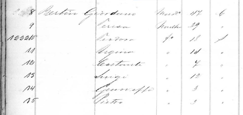 Luigi Bertin emigrate to Brazil with his parents and siblings (Teodora, Regina, Constante, Pietro e Genoveffa), travelling at the Steamship La France in 2/10/1888 to work in Sao Carlos for the farmer Manuel Antonio da Cunha. Luigi had another sister, Maria Bertin, who married Francesco Cavallari in São Carlos in 1/1/1910. Luigi Bertin married Eugenia Tinos in São Carlos in 5/3/1889. The couple Eugenia Tinos & Luigi Bertin had in total 17 children, although only 10 children survived: Luís (married with Diola), Nica, Berto, Wilson, Izabel, Auriza, Eudoxia, Osvaldo, ? e Sebastiao (married with Yraci Neves).