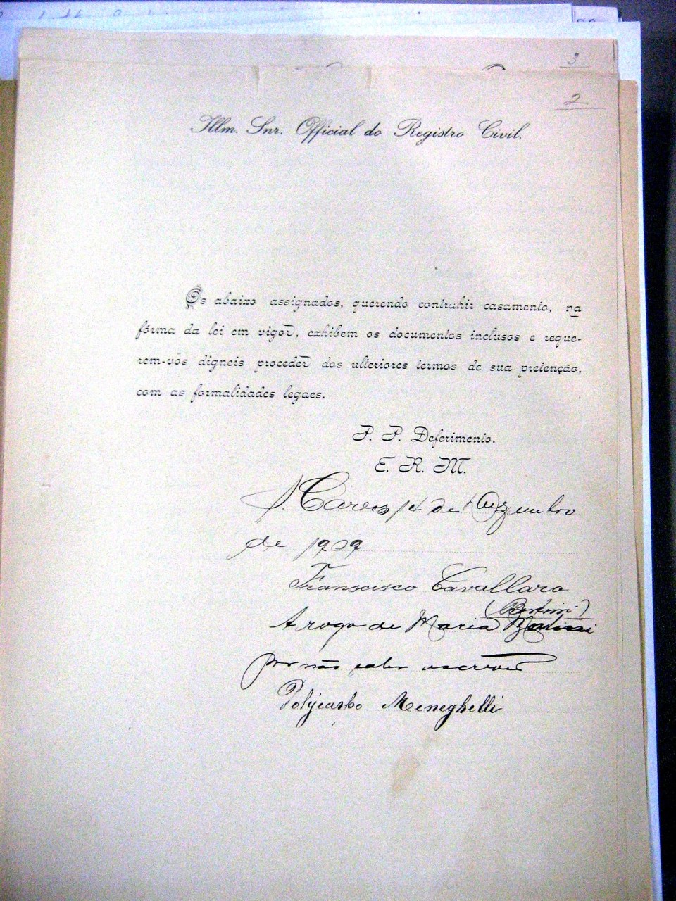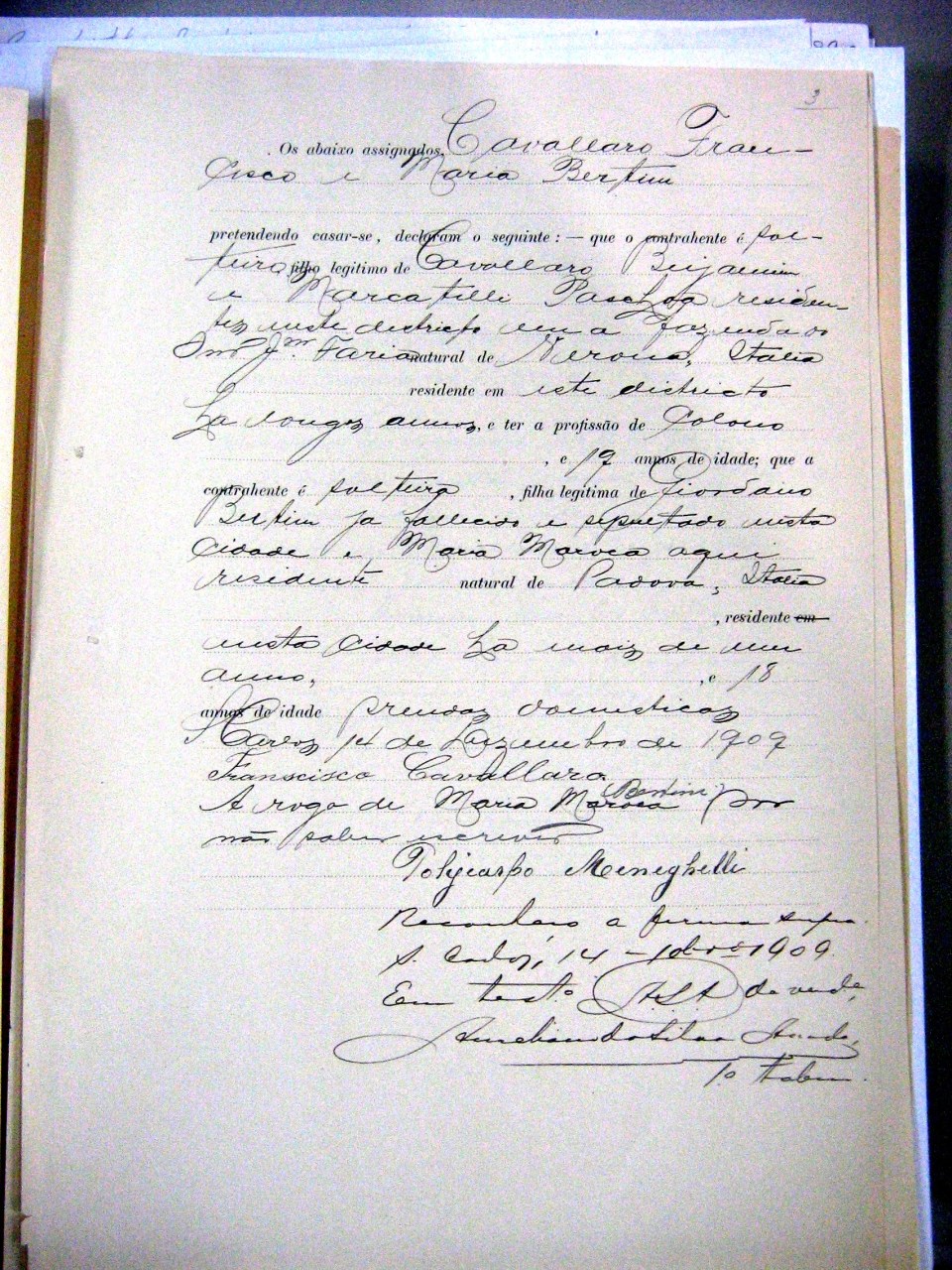 Casamento Civil e Justificativa de Casamento de Franchesco CAVALLARI & Maria BERTIN – Dec 1909