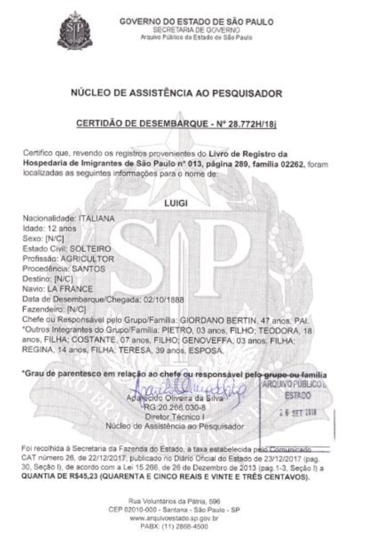 LUIGI BERTIN DEATH CERTIFICATE IN BRAZIL