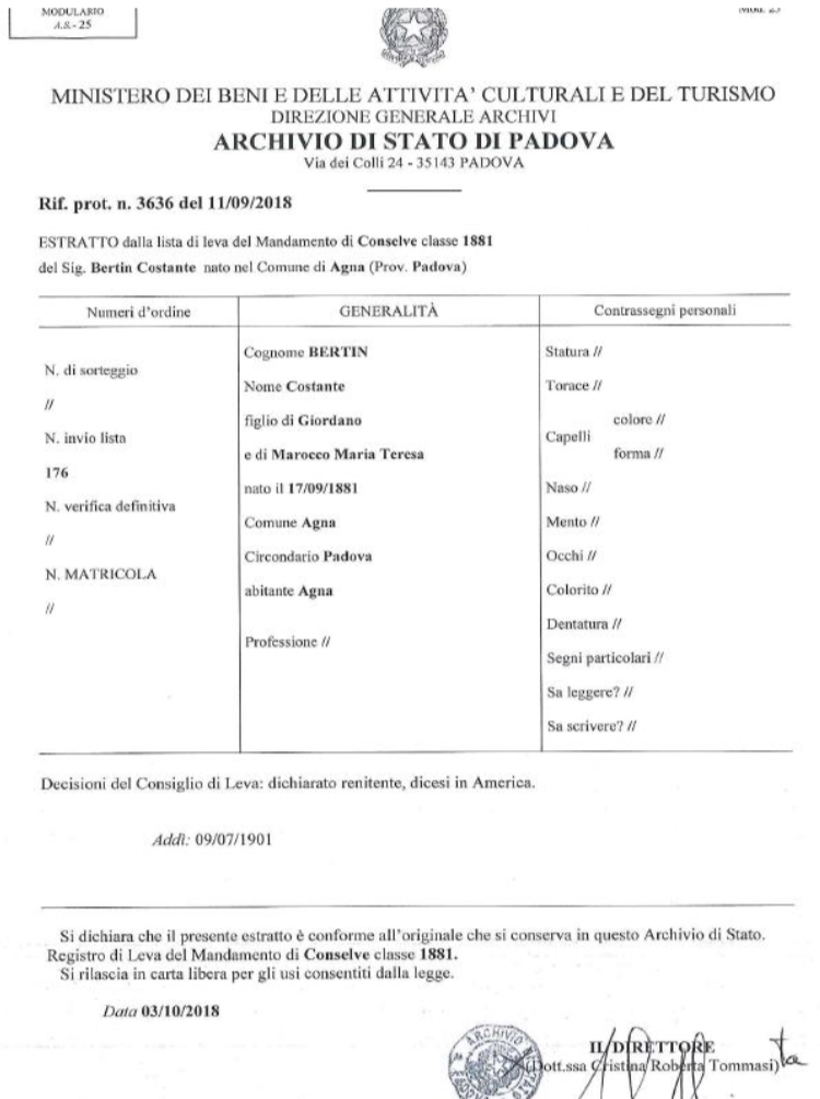 LISTA DI LEVA – MILITAR CERTIFICATE for brothers Luigi, Constante and Pietro