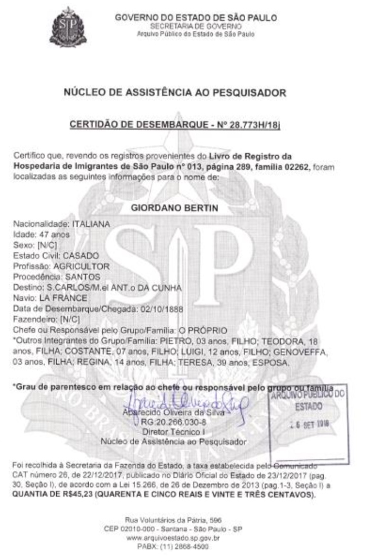 Luigi Bertin emigrate to Brazil with his parents and siblings (Teodora, Regina, Constante, Pietro e Genoveffa), travelling at the Steamship La France in 2/10/1888 to work in Sao Carlos for the farmer Manuel Antonio da Cunha. Luigi had another sister, Maria Bertin, who married Francesco Cavallari in São Carlos in 1/1/1910. Luigi Bertin married Eugenia Tinos in São Carlos in 5/3/1889. The couple Eugenia Tinos & Luigi Bertin had in total 17 children, although only 10 children survived: Luís (married with Diola), Nica, Berto, Wilson, Izabel, Auriza, Eudoxia, Osvaldo, ? e Sebastiao (married with Yraci Neves).