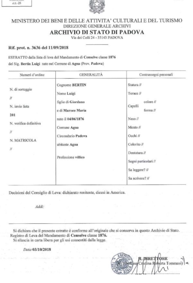Luigi Bertin , son of (Filho de) Giordano Bertin & Maria Teresa Maroco – *4/6/1876 – Agna Padova, Veneto, Italia.