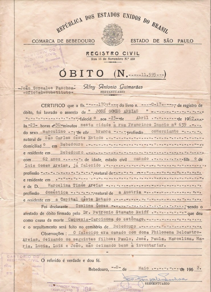– 1) Paternal – Imigração Cafeeira para Fazenda Santa Eudóxia, São Carlos, Bebedouro e Colina em São Paulo – Gomes Areias de Pombal, Portugal e Tinos do Friuli, Itália (Ex-Áustria)