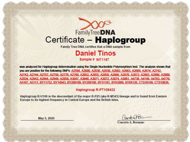 YDNA – Male Ancestor line of Antonio Tinos I via his great-grandson Daniel Tinos